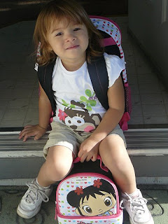 Oh my gosh.... Wavy. Your first day at school. We were all so worried that you would hate it, because you're so -- how can I put this delicately -- so anti-social? But after one day of a few tears (according to your teacher), you are enjoying yourself and making friends. Good for you, baby!